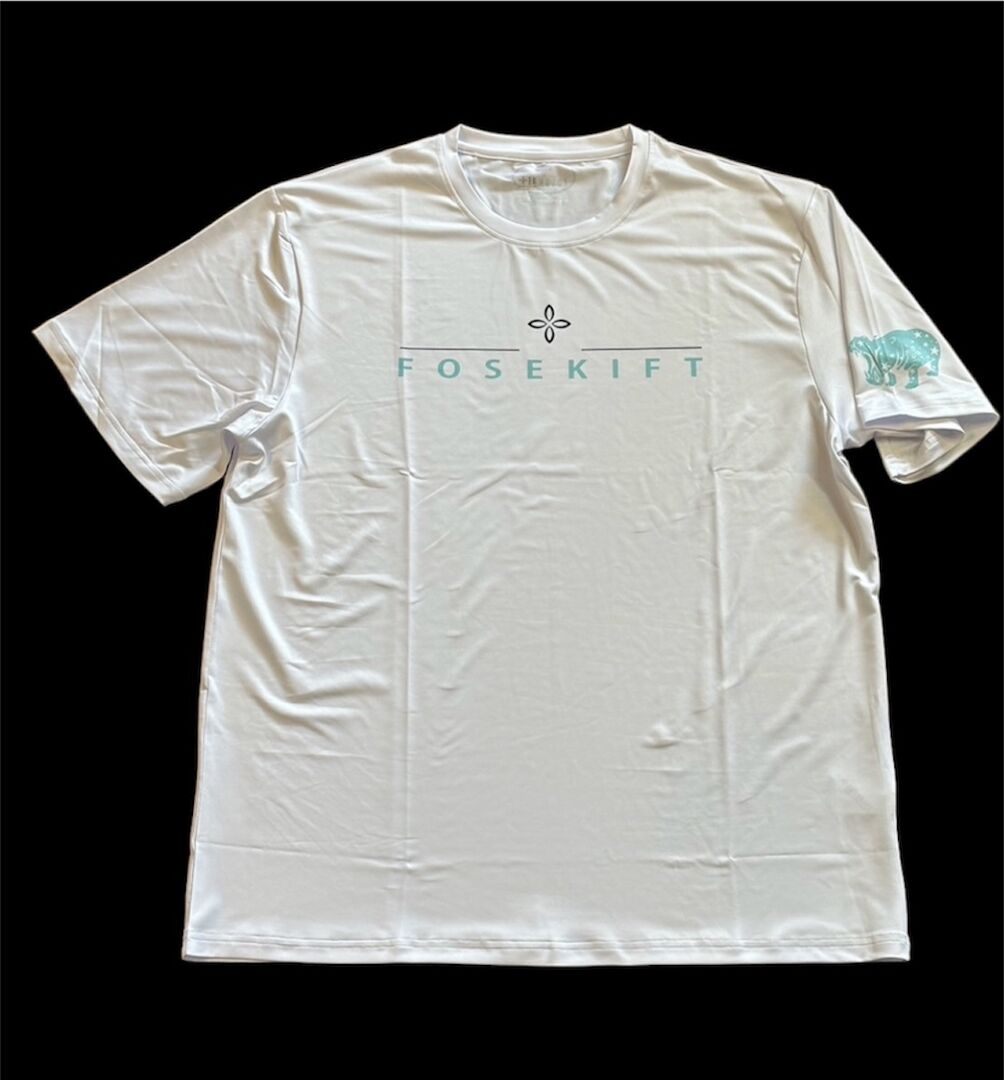 胸にFoseKift、左袖にカバをスカイブルーでプリント。生地を選び高級感のある上品な仕上がりになっています。