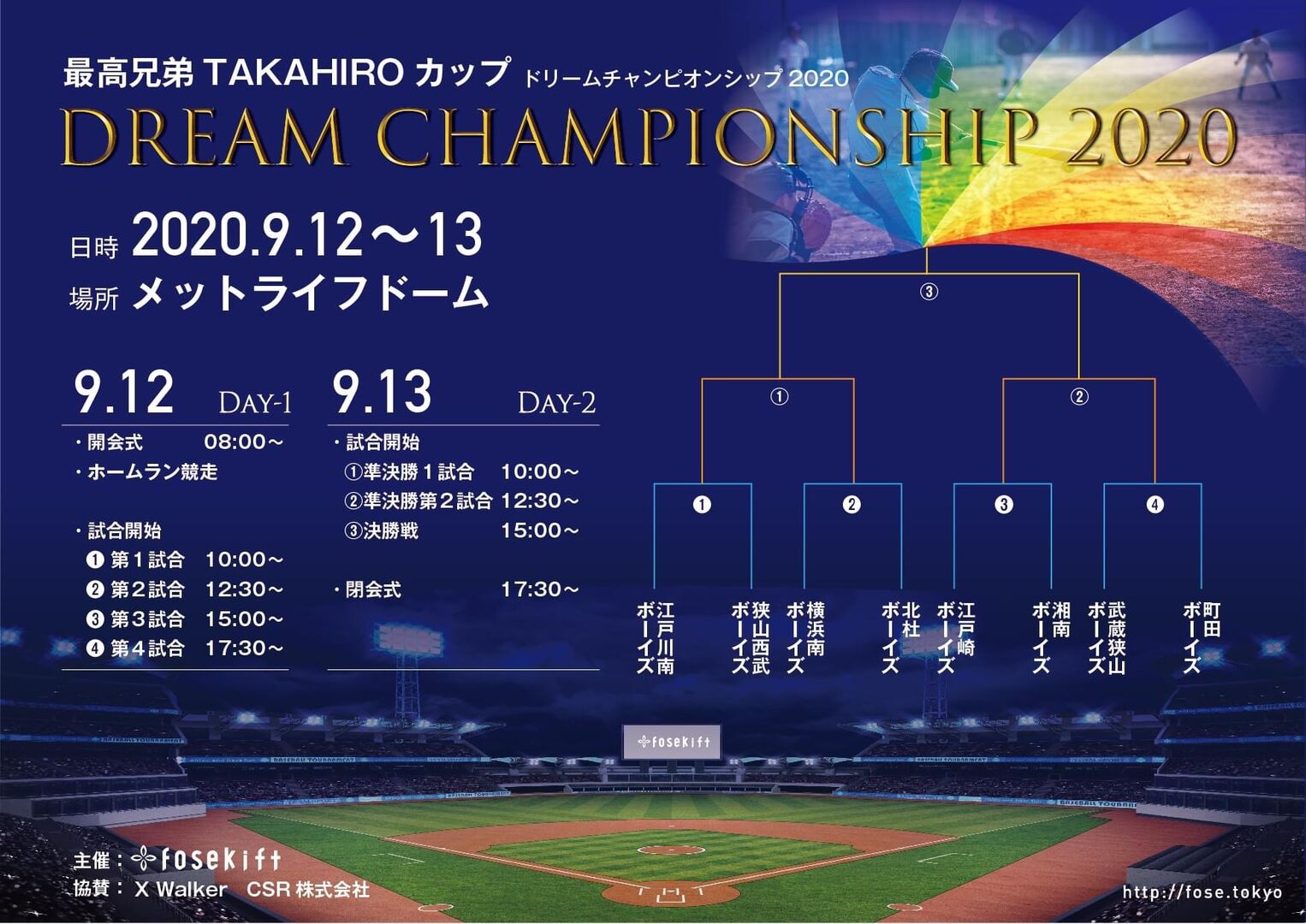 FoseKiftは新型コロナウイルスの影響で中止になった第51回 日本少年野球選手権大会に出場が決まっていた8チーム9月12日、13日、メットライフドームに招き、トーナメント試合を行うことを決めました。